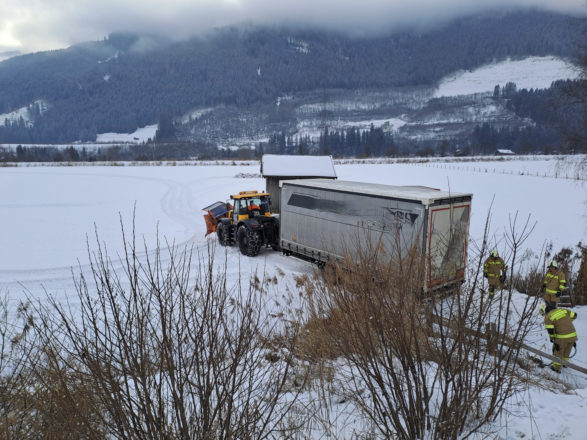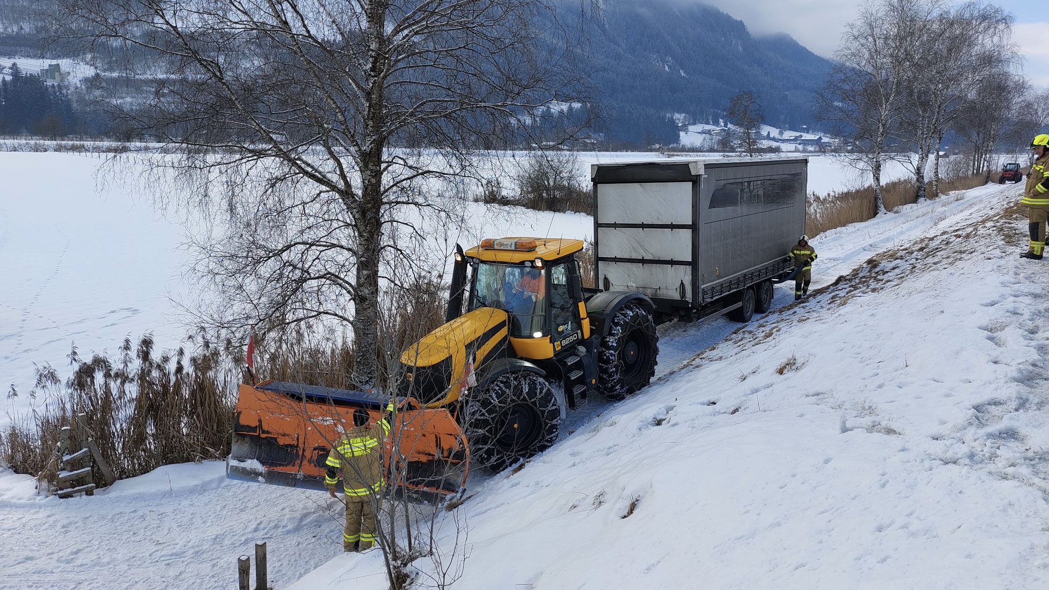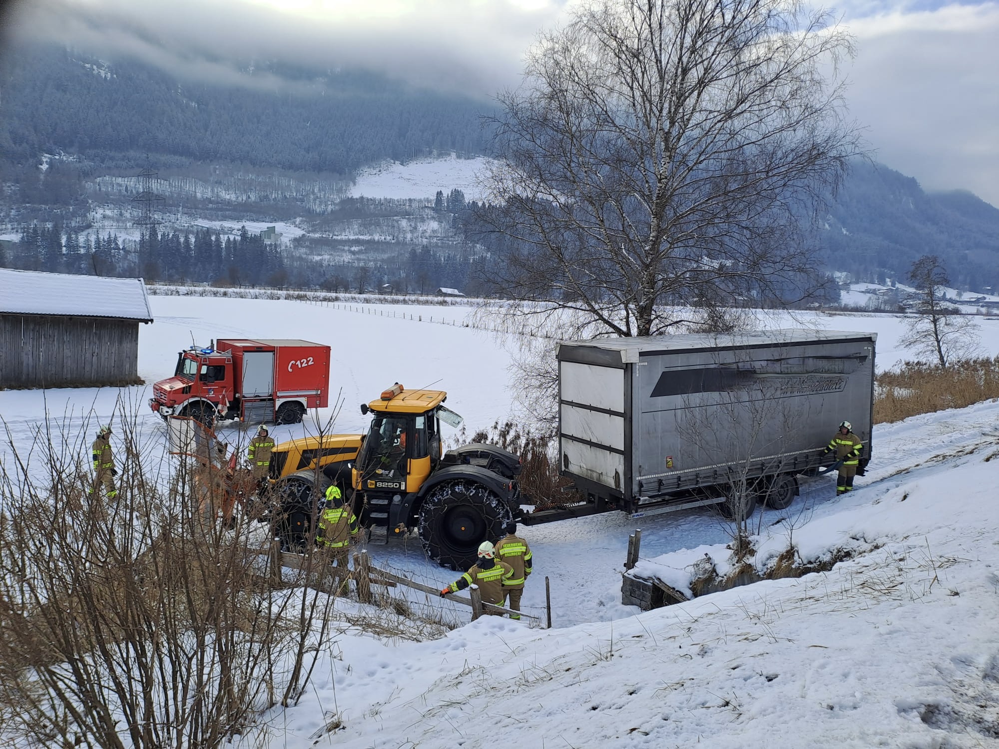 Der Anhänger wurde durch die Seilwinde von Rüstlösch Bramberg gesichert und vom Fahrzeug abgekoppelt, somit konnte das Zugfahrzeug mit Hilfe von LAST Bramberg über das gefrorene Feld auf befestigten Untergrund fahren.