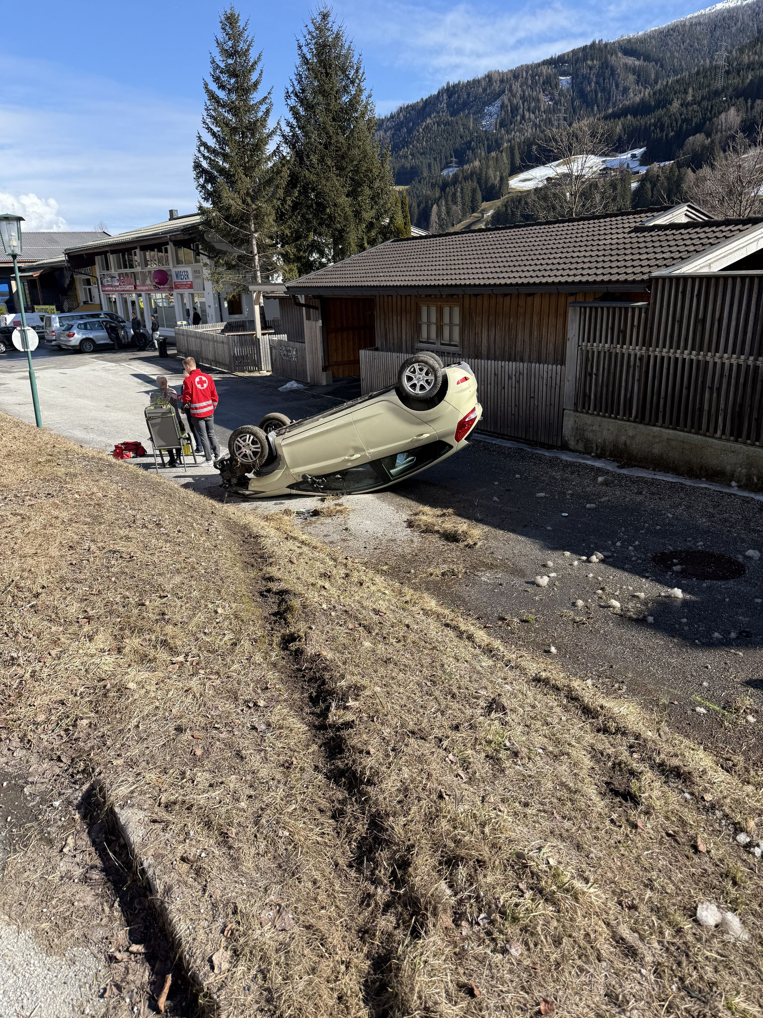 Ein Fahrzeug wollte die Fahrbahn queren, touchierte ein weiters Fahrzeug, stützte in Folge über die Böschung und blieb am Dach liegen. Bei Eintreffen der Einsatzkräfte war die Lenkerin bereits durch Passanten aus dem verunfallten PKW befreit.