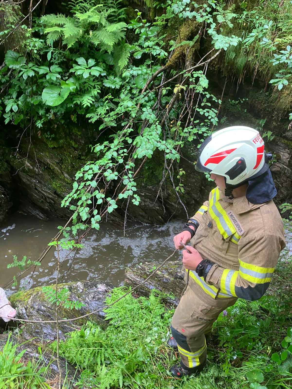 Das verschreckte Kalb wurde mit dem Tierrettungsgurt gesichert und mithilfe eines Seilzuges über eine ca. 3 m hohe Felsstufe aus dem Bachbett gezogen. Ermattet verbrachte das Tier die Nacht auf einem Plateau neben dem Bach. Die restlichen 50 Höhenmeter zur Weide konnte das Tier, trotz intensiver Mithilfe durch die Feuerwehr, nicht mehr überwinden. Etliche mannshohe Felsstufen und die einbrechende Dunkelheit hätte den Einsatz ohnedies zu gefährlich für die Feuerwehr gemacht.